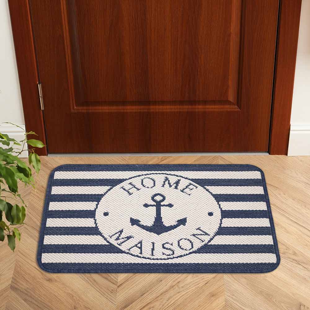 Die Fußmatte "Home Maison" in Blau und Beige setzt mit ihrem modernen Streifenmuster einen stilvollen Akzent in Ihrem Eingangsbereich. Die Kombination aus den ruhigen Farben Blau und Beige sorgt für eine angenehme, harmonische Atmosphäre. Besonders hervorstechend ist das runde Logo mit einem Anker und dem Schriftzug "Home Maison" in der Mitte, das der Matte eine besondere Note verleiht und sie zu einem echten Blickfang machMit dem Maß 50 x 70 cm hat die Fußmatte die perfekte größe für ihren innen oder Außenbereich. Dank der Anti-Rutsch-Beschichtung bleibt die Matte sicher an ihrem Platz, auch bei stärkerer Beanspruchung. Ihre flache Struktur sorgt dafür, dass sie mühelos unter Türen hindurchpasst, ohne dabei zu stören. Die sorgfältig eingekettelten Kanten erhöhen die Widerstandsfähigkeit und verhindern, dass die Matte im Laufe der Zeit ausfranst. Die "Home Maison" Fußmatte vereint funktionale Eigenschaften mit einem ansprechenden Design und ist die perfekte Wahl, um Ihren Eingangsbereich praktisch und gleichzeitig stilvoll zu gestalten.