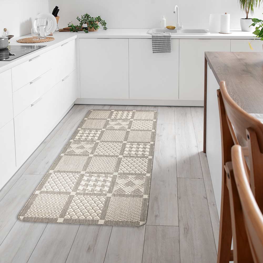 Die stabilen Kanten des Läufers sind ringsherum eingekettelt, was seine Haltbarkeit und Widerstandsfähigkeit erhöht. Besonders praktisch für Räume mit Fußbodenheizung, sorgt der Läufer dafür, dass die Wärme effizient durchkommt, ohne die Heizleistung zu beeinträchtigen. Mit seiner rechteckigen Form eignet er sich ideal für längliche Küchenräume oder als schützende Fläche vor Schränken und Arbeitsflächen. Das flache Gewebe ist pflegeleicht und hält auch intensiver Nutzung stand, sodass der Läufer lange wie neu aussieht.