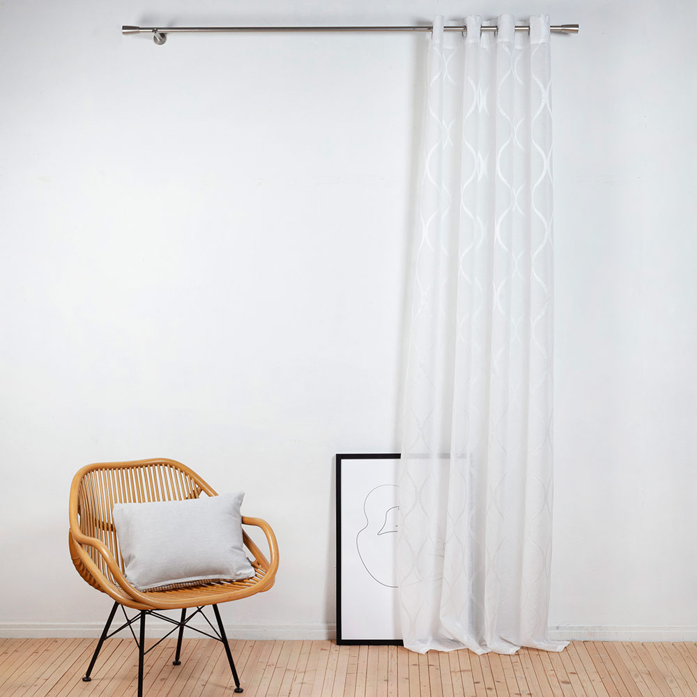 Der Fertigschal Theodora überzeugt in uni weißen und einem fein eingewebten, dezent glänzenden Wellenmuster. Der halbtransparente Vorhang sorgt für ein stilvolles Lichtspiel und verleiht dem Raum eine elegante Atmosphäre. Mit einer Breite von 135 cm und einer Höhe von 245 cm eignet sich diese Gardine ideal für verschiedene Fenstergrößen. Die Aufhängung durch Ösen ermöglicht eine einfache Montage und einen gleichmäßigen Faltenfall. Theodora ist die perfekte Wahl für alle, die zeitlose Eleganz und Leichtigkeit in ihr Zuhause bringen möchten.