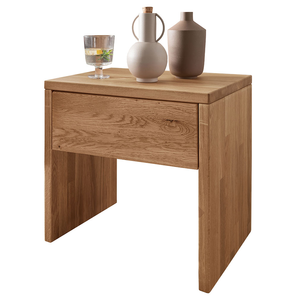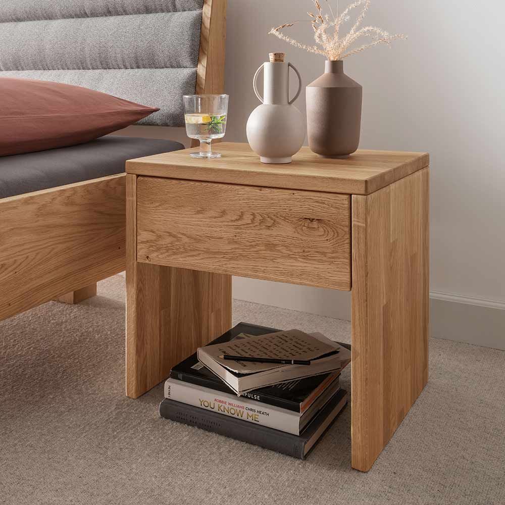 Diese Nachtkommode aus Holz überzeugt durch ihr zeitloses Design und die hochwertige Verarbeitung. Gefertigt aus Wildeiche bringt sie eine natürliche Ausstrahlung und ein natürliches Holzbild in den Schlafbereich. Durch ihre kompakte Form eignet sich die Nachtkommode ideal als praktische Ablagefläche neben dem Bett und bietet zusätzlichen Stauraum in der integrierten Schublade. Mit einer Höhe und Breite von 45 cm sowie einer Länge und Tiefe von 35 cm bietet sie optimal Platz für persönliche Gegenstände und fügt sich harmonisch in unterschiedliche Einrichtungskonzepte ein.