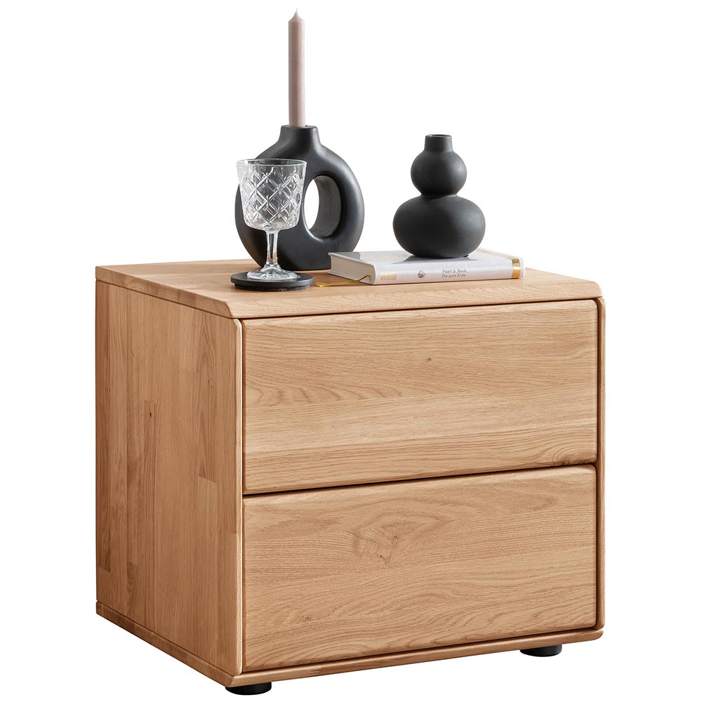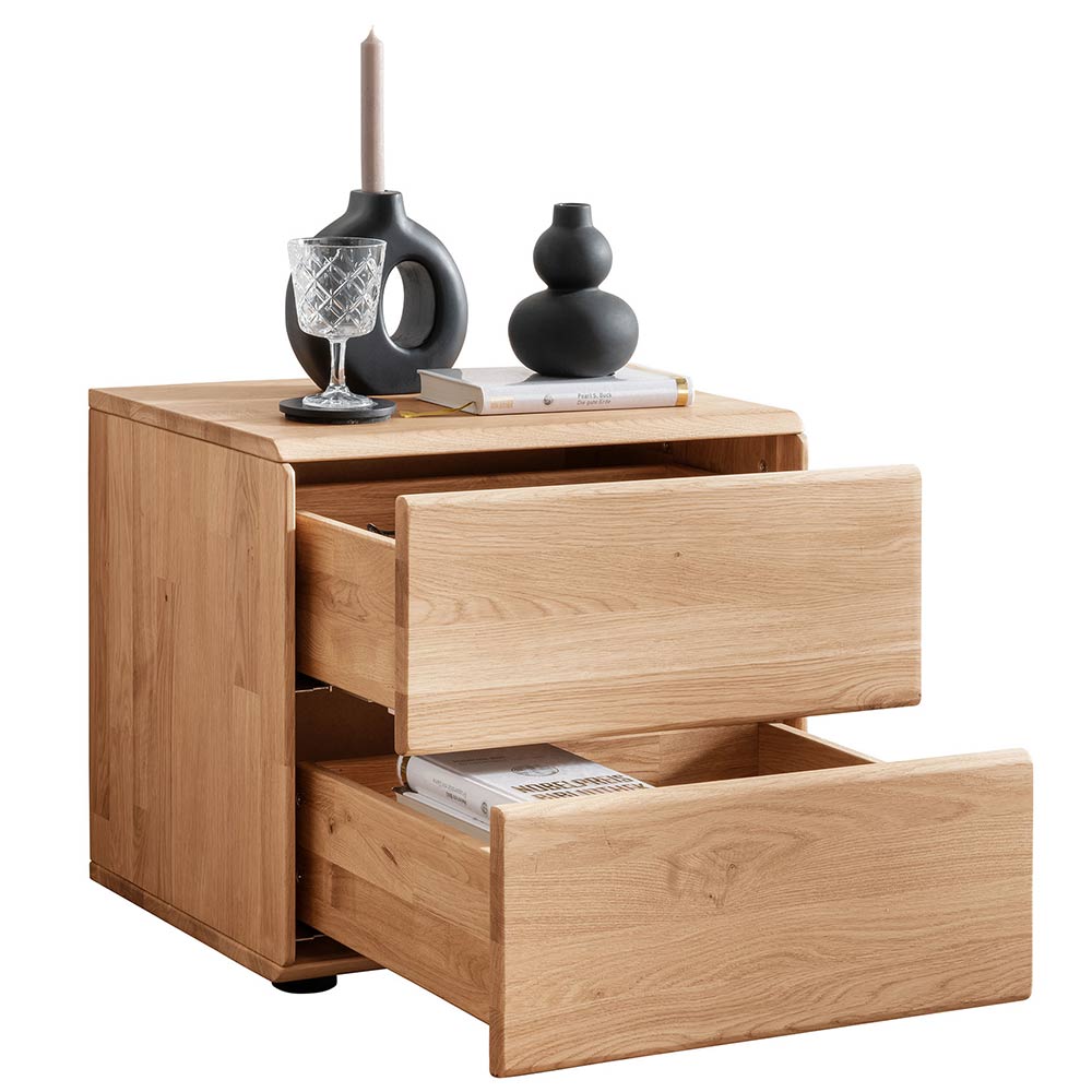 Zeitloser Nachttisch! Diese Nachtkommode Nako 1 aus massivem Wildeichenholz überzeugt durch ihr zeitloses Design und die hochwertige Verarbeitung. Geölt bringt sie eine natürliche Ausstrahlung und das charakteristische Holzbild der Wildeiche in den Schlafbereich. Mit einer Höhe von 45 cm, einer Breite von 51 cm und einer Tiefe von 40 cm eignet sie sich ideal als praktische Ablagefläche neben dem Bett und bietet zusätzlichen Stauraum in den zwei integrierten Schubladen. So lassen sich persönliche Gegenstände ordentlich verstauen und stets griffbereit aufbewahren. Dank ihrer harmonischen Proportionen und der natürlichen Holzoptik fügt sich die Nachtkommode nahtlos in unterschiedliche Einrichtungskonzepte ein.