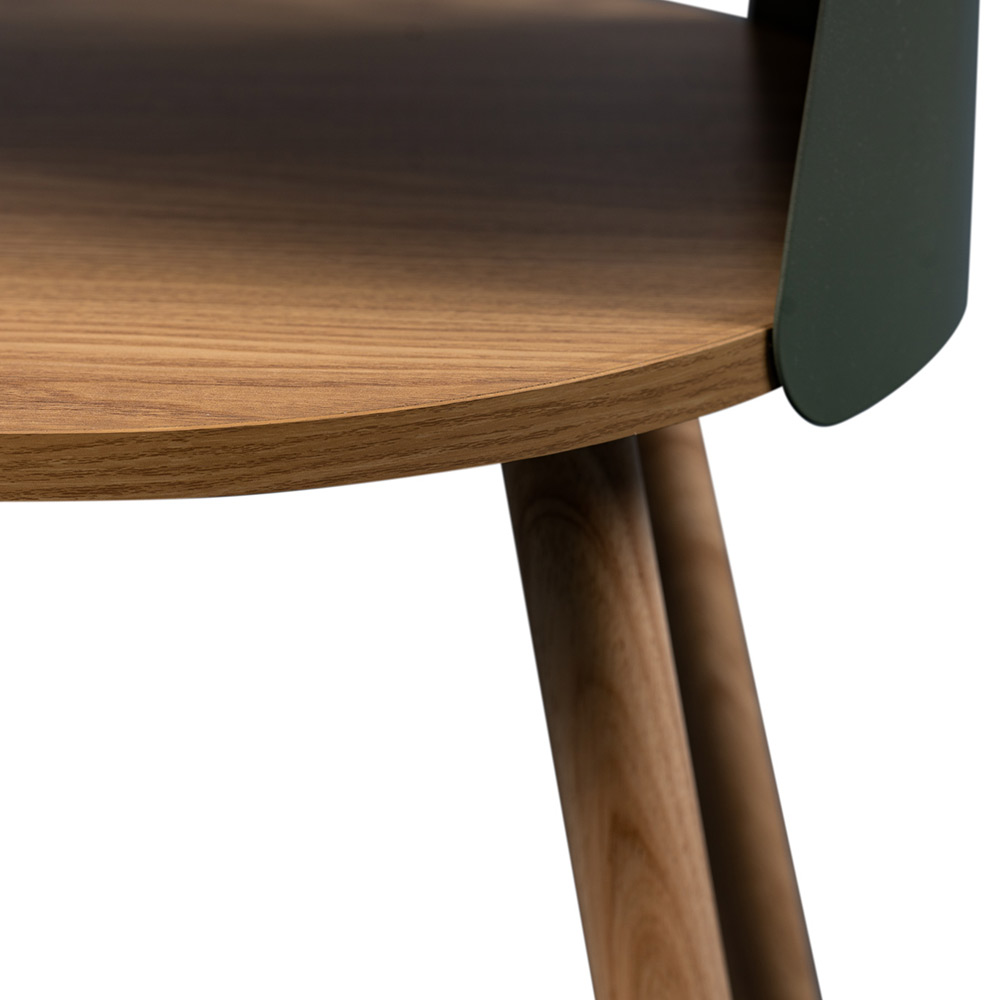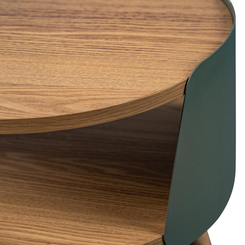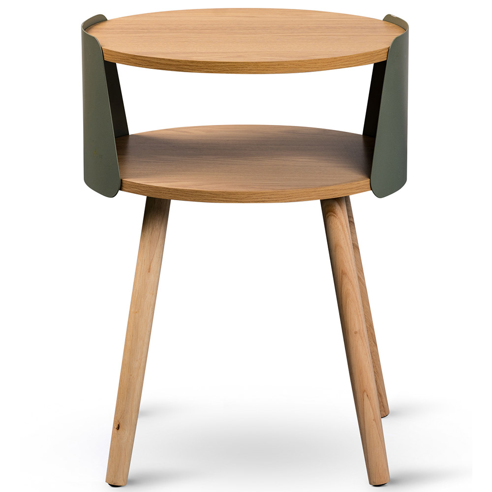 Der Beistelltisch Sandro überzeugt durch sein modernes, rundes Design mit grünem Metallkorpus und stabilen Holzbeinen aus Eiche. Die obere Platte dient als praktische Tischfläche, während die untere Ablage zusätzlichen Stauraum für Bücher, Zeitschriften oder Dekoration bietet. Mit einer Höhe von 55 cm und einem Durchmesser von 40 cm lässt sich der Tisch flexibel im Raum platzieren und fügt sich harmonisch in unterschiedliche Wohnkonzepte ein.