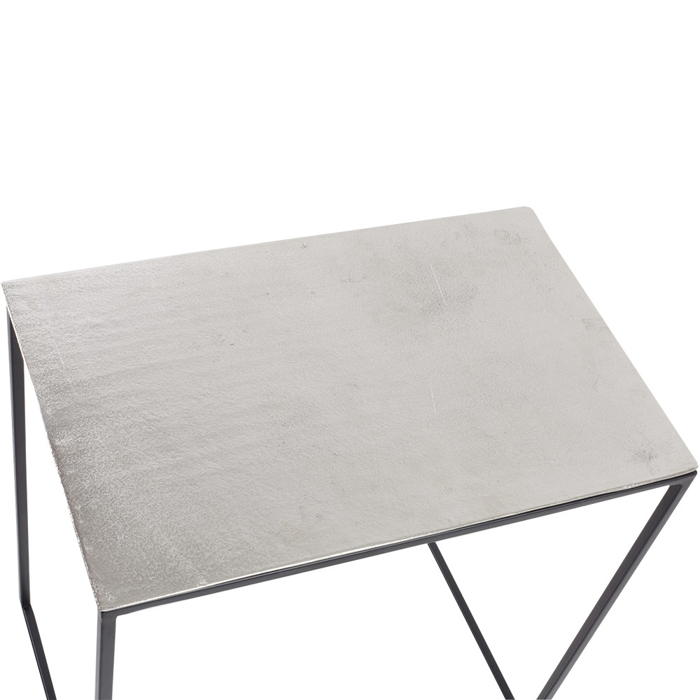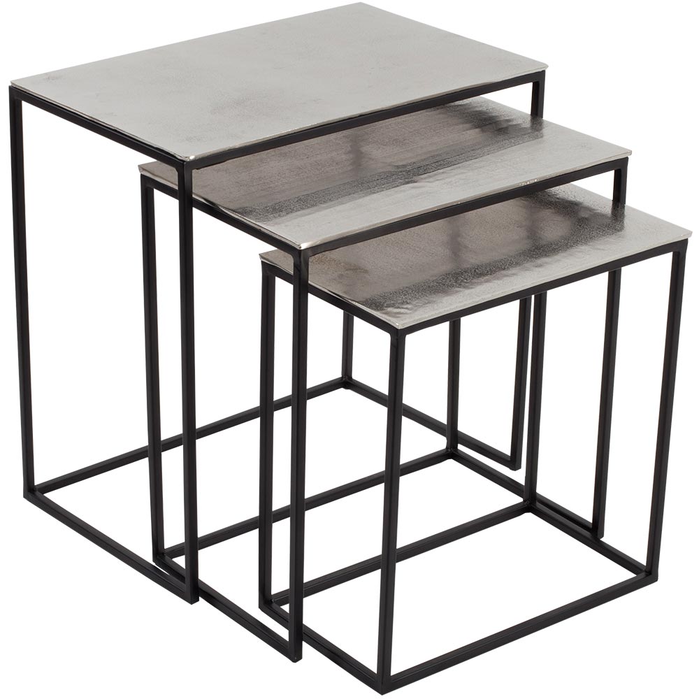 Dieses 3-teilige Set an Beistelltischen in jeweils drei unterschiedlichen Größen macht Ihren Wohnraum komplett und sticht besonders mit der strukturierten Oberflächenstruktur auf der Tischplatte heraus. Sowohl die Tischplatten als auch die schwarzen Beine sind aus Metall gefertigt und passen sich jedem Einrichtungsstil perfekt an.