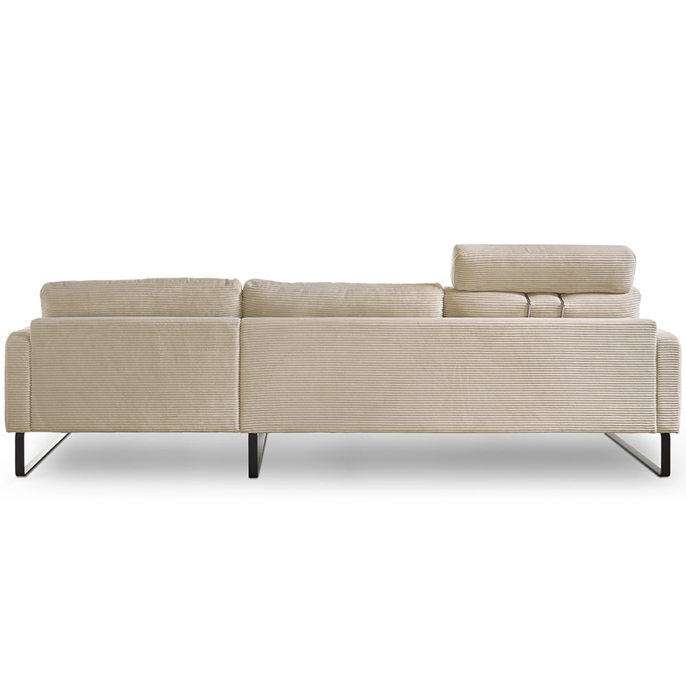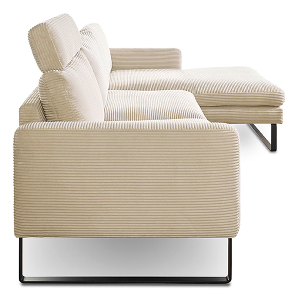 Machen Sie es sich gemütlich auf der beigen Polstergarnitur im modernen Cord Look. Das Cordsofa Ricadi hat eine hervorragende Sitzqualität durch die Stahl-Wellenunterfederung in der Kombination mit den losen Sitzkissen aus Kaltschaum. Für einen besseren Halt sorgen die Klettbänder unter den Sitzkissen. Die losen Rückenkissen sind mit einem hochwertigen Kammerkissen ausgestattet, das das Füllmaterial gleichmäßig verteilt. Die tragenden Teile des Gestells bestehen aus Massivholz, dadurch ist das Sofa beständig und stabil. Vervollständigt wird der moderne Look durch die schwarzen Metallkufen im Matten Design. Die Couch hat die Stellmaße 154 cm x 298 cm und ist 81 cm hoch. Die Sitzhöhe beträgt 46 cm und die Sitztiefe 59 cm. Die Lieferung erhalten Sie teilmontiert in zwei Teilen mit Aufbauanleitung.