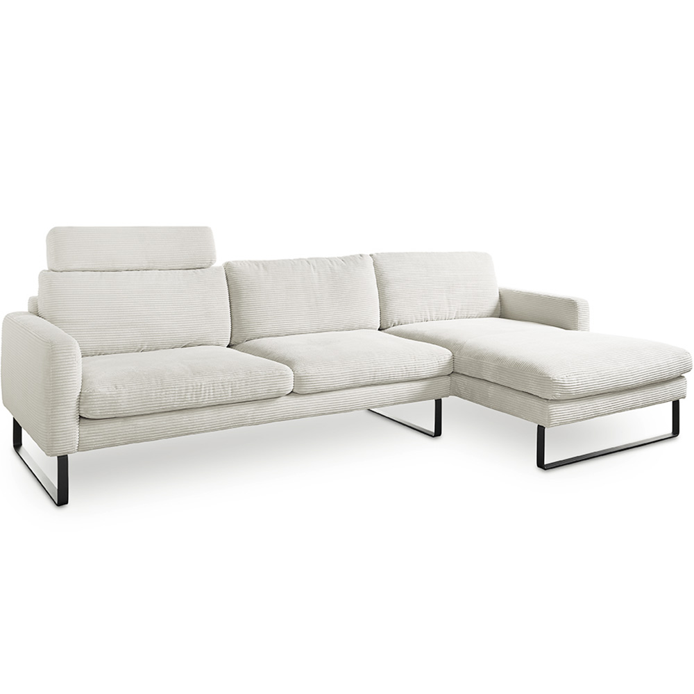 Machen Sie es sich gemütlich auf der weißen Polstergarnitur im modernen Cord Look. Das Cordsofa Ricadi hat eine hervorragende Sitzqualität durch die Stahl-Wellenunterfederung in der Kombination mit den losen Sitzkissen aus Kaltschaum. Für einen besseren Halt sorgen die Klettbänder unter den Sitzkissen. Die losen Rückenkissen sind mit einem hochwertigen Kammerkissen ausgestattet, das das Füllmaterial gleichmäßig verteilt. Die tragenden Teile des Gestells bestehen aus Massivholz, dadurch ist das Sofa beständig und stabil. Vervollständigt wird der moderne Look durch die schwarzen Metallkufen im Matten Design. Die Couch hat die Stellmaße 154 cm x 298 cm und ist 81 cm hoch. Die Sitzhöhe beträgt 46 cm und die Sitztiefe 59 cm. Die Lieferung erhalten Sie teilmontiert in zwei Teilen mit Aufbauanleitung.