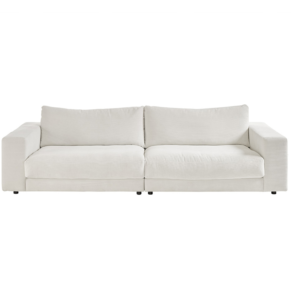 Machen Sie es sich gemütlich auf der weißen Polstergarnitur im modernen Feincord Look. Das Feincordsofa Seventies hat eine hervorragende Sitzqualität durch die Stahl-Wellenunterfederung in der Kombination mit dem PUR-Schaum, der sich an die Körperform anpasst. Das hochwertige Kammerkissen sorgt dafür, dass das Füllmaterial gleichmäßig verteilt ist. Die tragenden Teile des Gestells bestehen aus Massivholz, dadurch ist das Sofa beständig und stabil. Die Couch hat die Stellmaße 107 cm x 250 cm und ist 85 cm hoch. Die Sitzhöhe beträgt 43 cm und die Sitztiefe 64 cm. Die Lieferung erhalten Sie teilmontiert in zwei Teilen mit Aufbauanleitung.