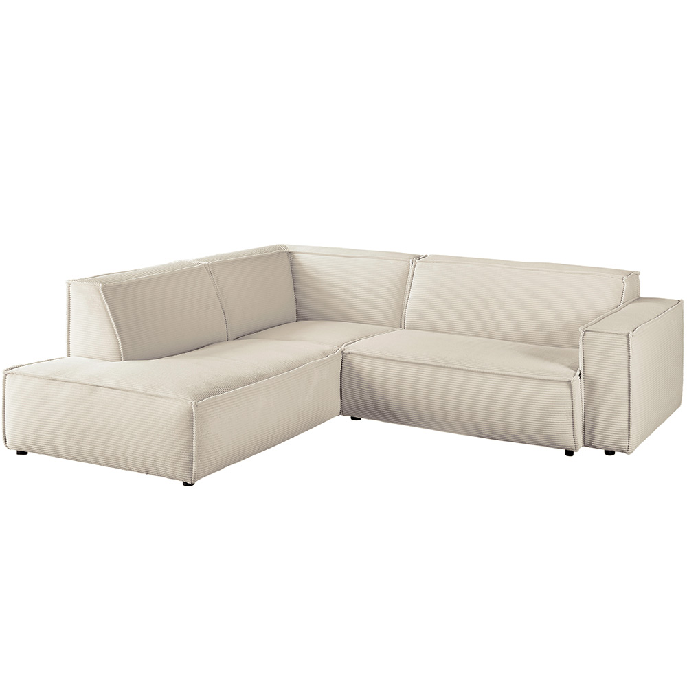 Machen Sie es sich gemütlich auf der naturfarbenen Polstergarnitur im modernen Cord Look. Das Cordsofa Upper East hat eine hervorragende Sitzqualität durch die Stahl-Wellenunterfederung in der Kombination mit dem PUR-Schaum, der sich an die Körperform anpasst. Der Rücken ist ergonomisch aus Schaumstoff geformt. Die tragenden Teile des Gestells bestehen aus Massivholz, dadurch ist das Sofa beständig und stabil. Die Couch hat die Stellmaße 254 cm x 224 cm und ist 72 cm hoch. Die Sitzhöhe beträgt 40 cm und die Sitztiefe 70 cm. Die Lieferung erhalten Sie teilmontiert in zwei Teilen mit Aufbauanleitung.
