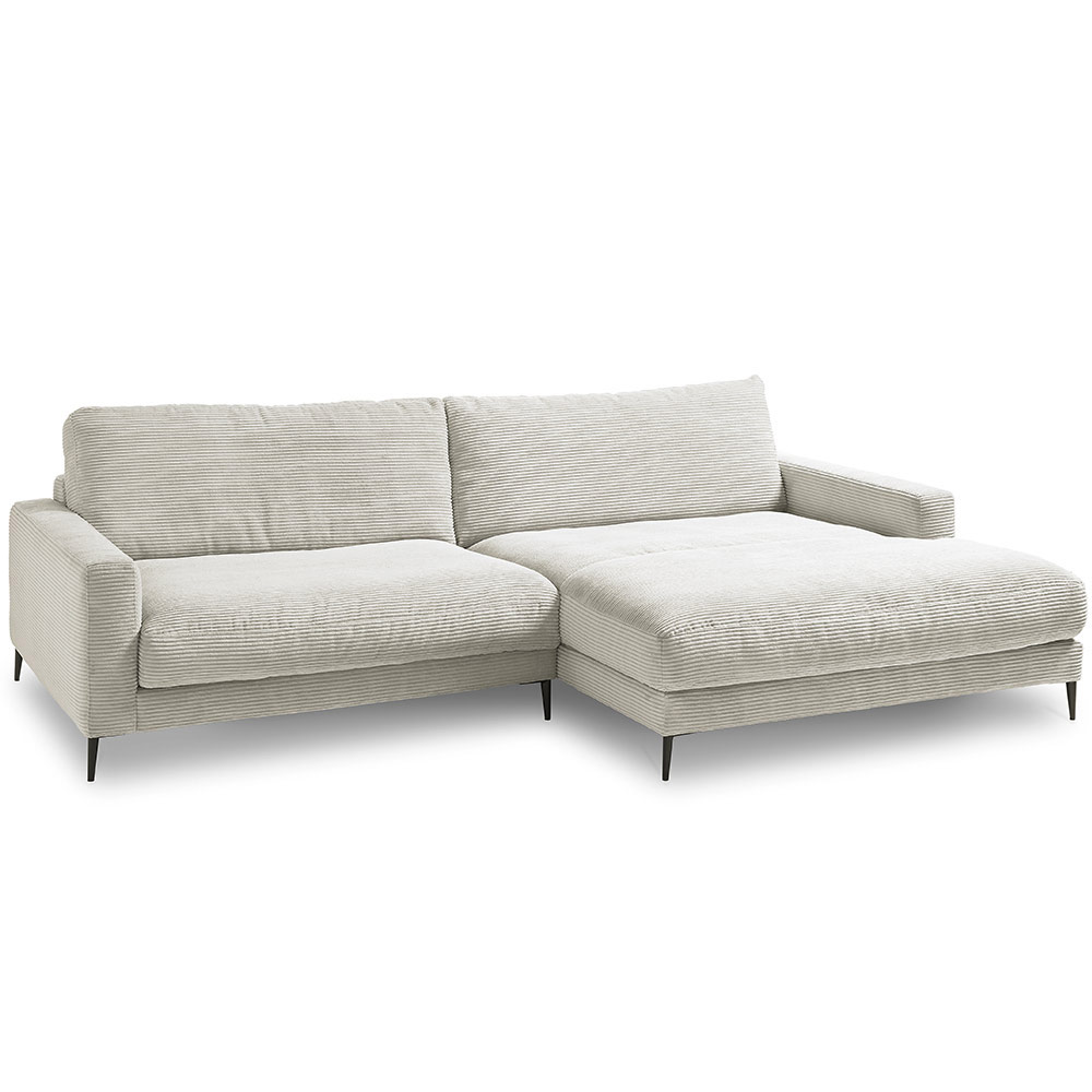 Machen Sie es sich gemütlich auf der hellgrauen Polstergarnitur im modernen Cord Look. Das Cordsofa Uptown hat eine hervorragende Sitzqualität durch die Stahl-Wellenunterfederung in der Kombination mit dem PUR-Schaum, der sich an die Körperform anpasst. Das hochwertige Kammerkissen sorgt dafür, dass das Füllmaterial gleichmäßig verteilt ist. Die tragenden Teile des Gestells bestehen aus Massivholz, dadurch ist das Sofa beständig und stabil. Vervollständigt wird der moderne Look durch die schwarzen Metallfüße im Matten Design. Die Couch hat die Stellmaße 272 cm x 190 cm und ist 84 cm hoch. Die Sitzhöhe beträgt 44 cm und die Sitztiefe 84 cm. Die Lieferung erhalten Sie teilmontiert in zwei Teilen mit Aufbauanleitung.