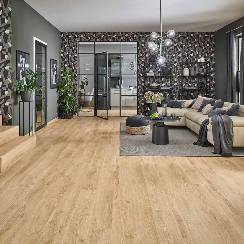 Fresh Oak aus der JOKA Kollektion 340 ist ein Klebevinylboden mit heller, natürlicher Holzoptik. Das ruhige Eichenbild bringt Leichtigkeit in den Raum und lässt sich vielseitig mit modernen wie klassischen Einrichtungsstilen kombinieren. Die umlaufende Fase sorgt für eine klare Dielenstruktur und ein hochwertiges Erscheinungsbild. Durch die vollflächige Verklebung entsteht eine stabile Verbindung mit dem Untergrund – ideal für stark genutzte Wohn- oder Objektbereiche. Der Boden ist feuchtraumgeeignet, mit Warmwasser-Fußbodenheizungen kombinierbar und erfüllt mit Nutzungsklasse 32 sowie einer 0,40 mm starken Nutzschicht die Anforderungen an einen langlebigen Bodenbelag. Zertifizierungen wie FloorScore und Indoor Air Comfort unterstreichen seine Wohngesundheit.