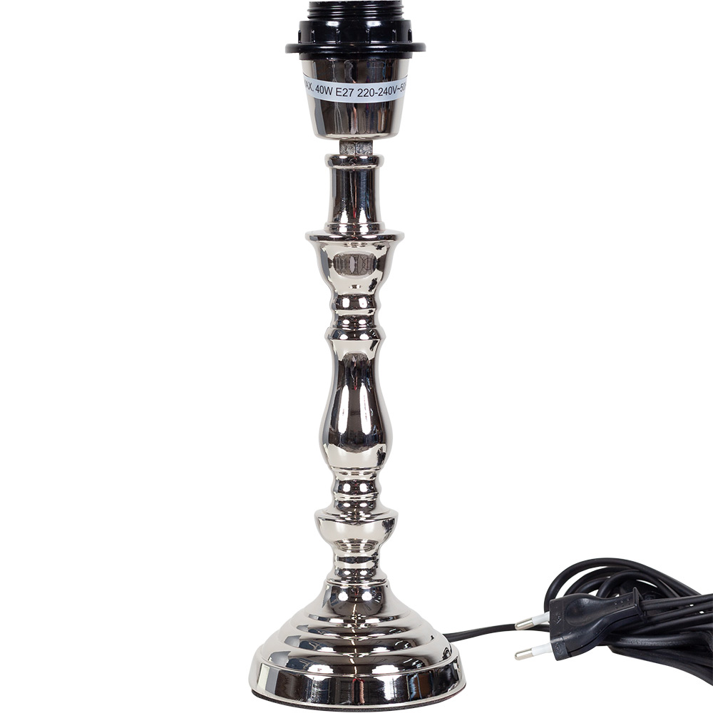 Dieser Lampenfuß aus Metall zeigt sich in einer edel glänzenden Materialität in einem hellen Silber. Mit einem Lampenschirm nach Wahl kann er leicht kombiniert und in unterschiedlichen Einrichtungsstilen dekorativ eingesetzt werden. Der schlichte und elegante Leuchtenfuß misst eine Höhe von 21,5 cm und eine Breite von ungefähr 8,9 cm. Er ist mit einem Kippschalter und einem 2,5 m langen Kabel versehen.