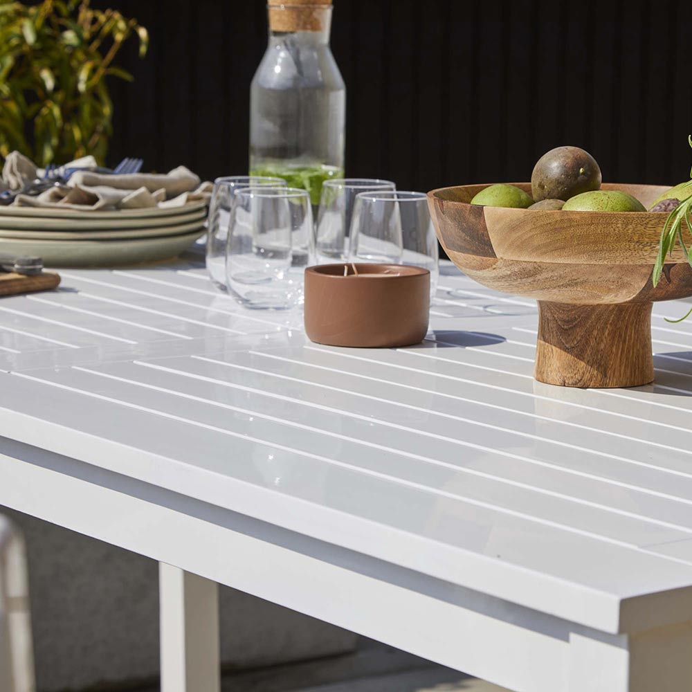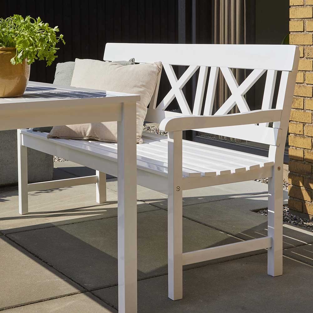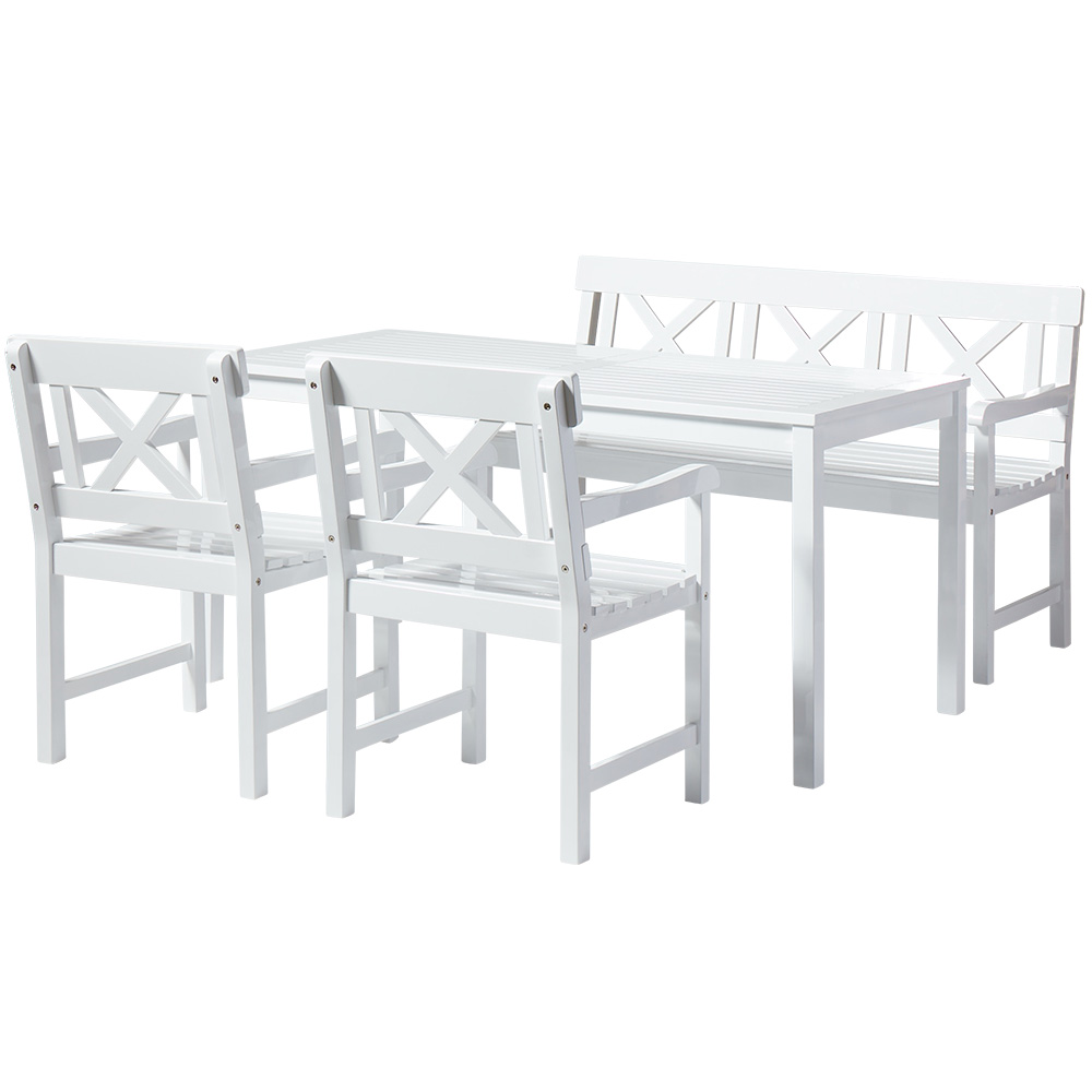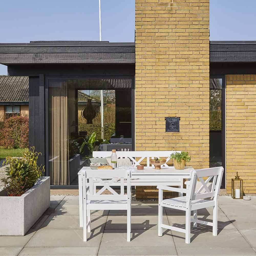 Das Sofiero Outdoor-Set besteht aus einem Tisch, einer Bank und zwei Stühlen und bietet eine stilvolle Sitzlösung für den Außenbereich. Gefertigt aus Holz überzeugt das Set durch seine natürliche Optik und eine zeitlose Ausstrahlung. Die Grundfarbe Weiß fügt sich harmonisch in unterschiedliche Umgebungen ein und sorgt für ein warmes, einladendes Gesamtbild.