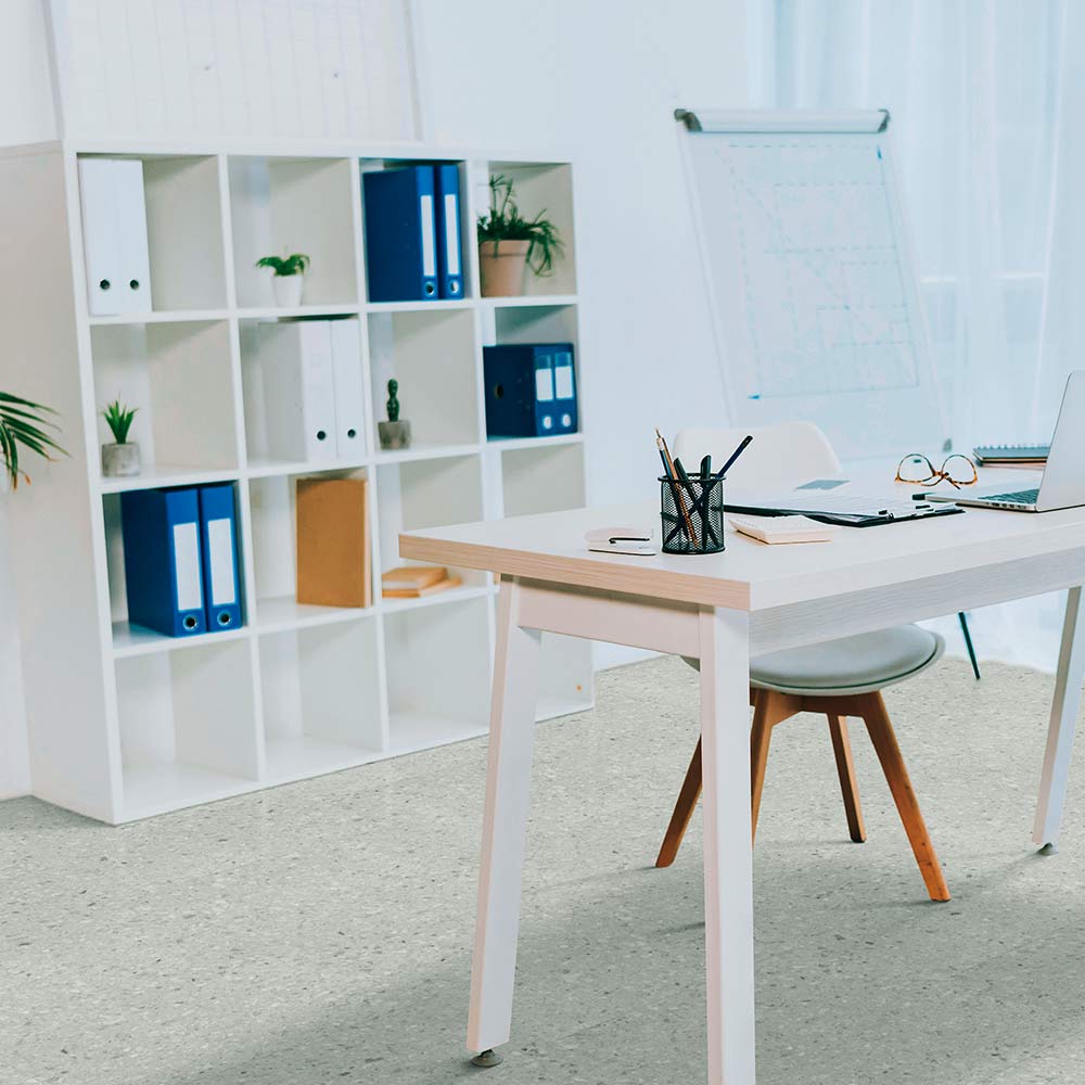 Drehstuhl mit schwarzer Polsterung steht auf einer transparenten Bodenschutzmatte mit Noppen. Der Tisch mit einer Tastatur ist im Hintergrund sichtbar. Bodenschutzmatte Ecopro