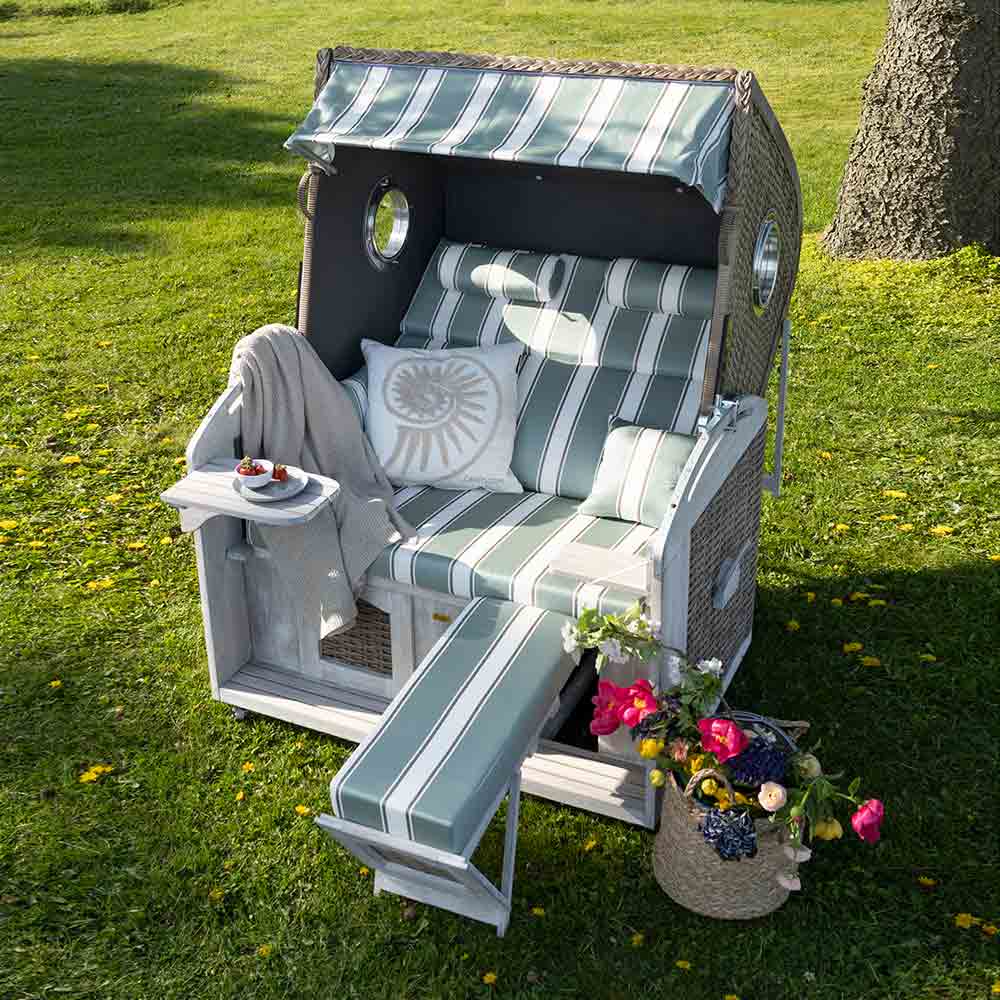 Entspannen Sie stilvoll am Strand oder im Garten mit unserem Strandkorb Fehmarn! Dieser Strandkorb ist aus Pinien-Massivholz gefertigt und verfügt über ein shabby-chic Gestell mit einer Breite von 135 cm und einer Länge von 98 cm. Mit einer Höhe von 160 cm bietet er viel Platz zum Entspannen. Dank der Rollen ist er leicht zu bewegen. Die grün-weiß gestreiften Kissen können herausgenommen werden und der abnehmbare, waschbare Polyesterbezug sorgt für einfache Reinigung. Die Sitzfläche ist in Grün-weiß gehalten und bietet dank der Schaumstoffpolsterung hohen Komfort. Zusätzlich ist der Strandkorb mit einem verstellbaren Kopf- und Fußteil ausgestattet, um individuellen Komfort zu bieten. Sie erhalten den Strandkorb teilmontiert mit zusätzlicher Montageanleitung.