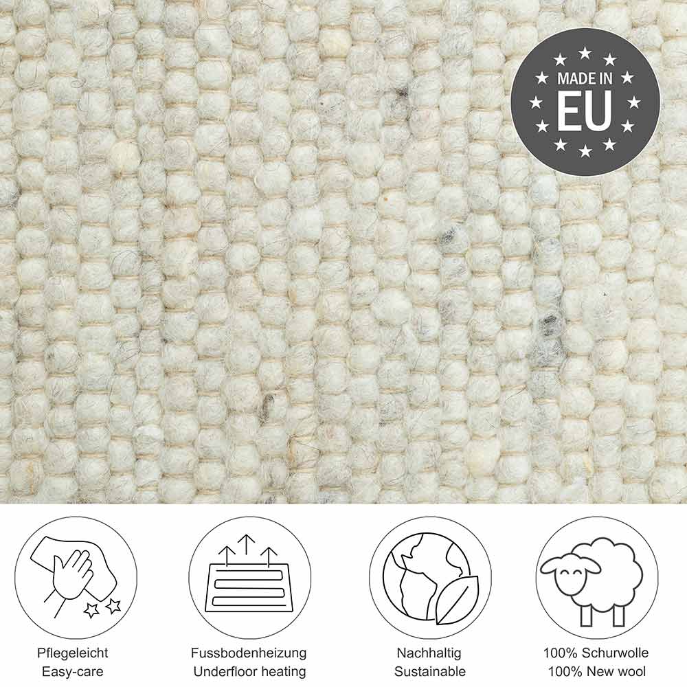 - Besondere Eigenschaften: sehr strapazierfähig und für alle Wohnbereiche geeignet. Handgewebt in Griechenland. Melierter Flor.