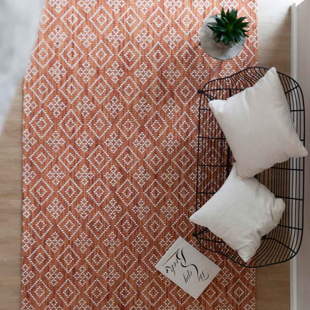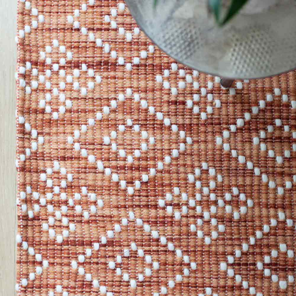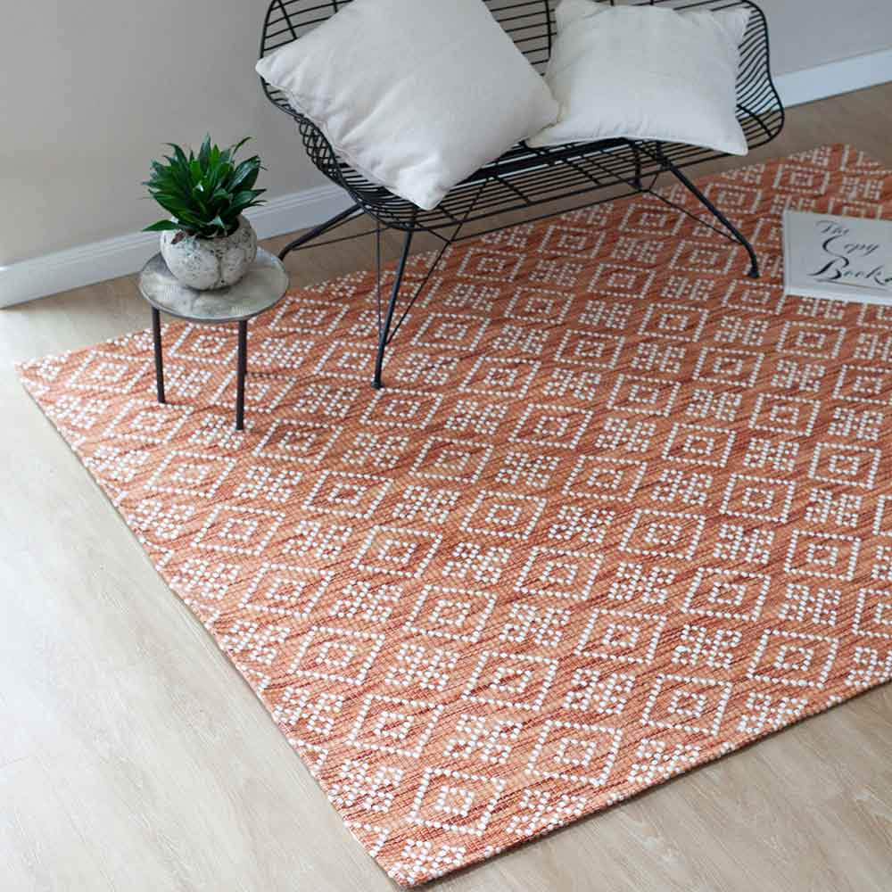 Ihnen zu Füßen liegt dieser rechteckige Naturteppich aus 100% Wolle. Sein hochwertiges Flachgewebe ist handgearbeitet und zeigt sich in einem angesagten Kupferton mit zierendem Rautenmuster. Er eignet sich ideal für die Nutzung auf einer Fußbodenheizung und ist in verschieden Farben und Maßen erhältlich. Dieser Woll-Teppich ist 160 x 230 cm groß.