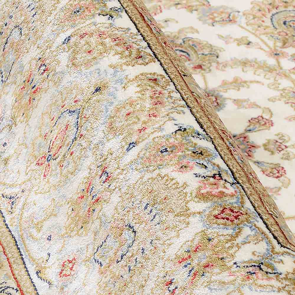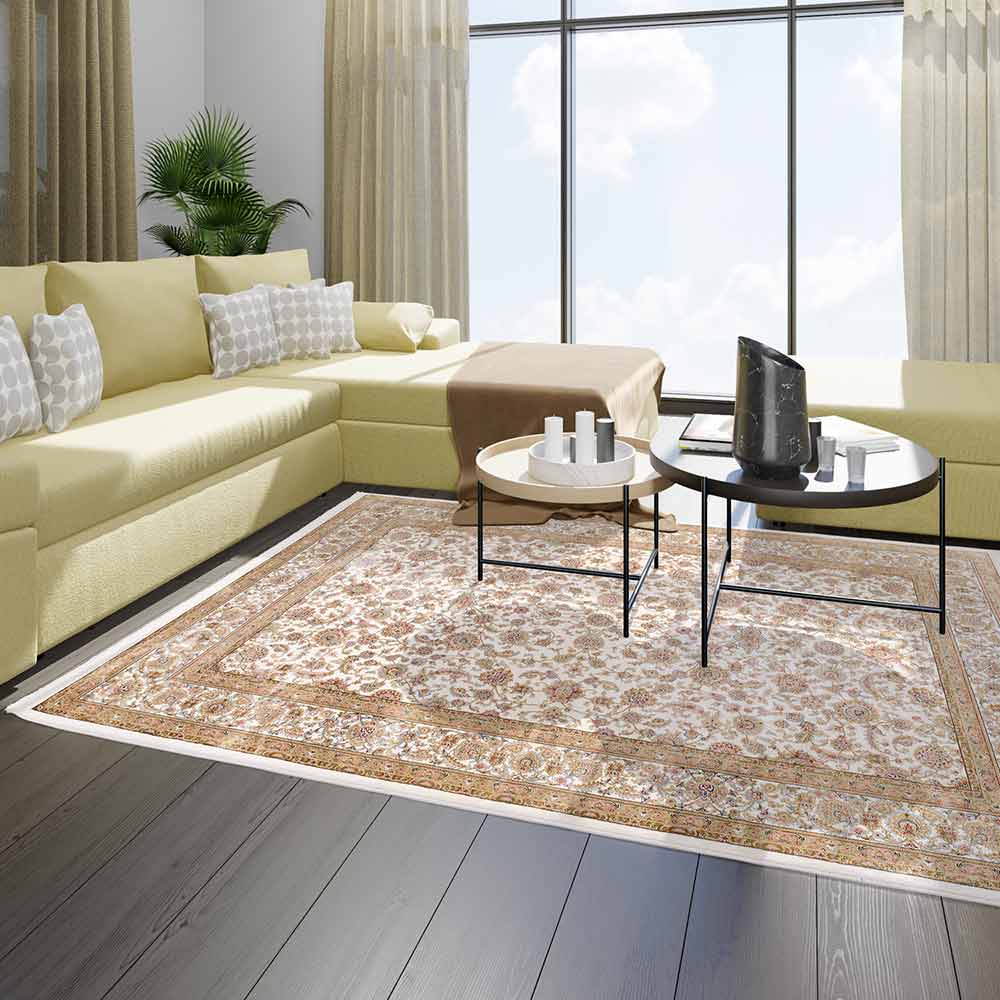Der Teppich Inspiration Keshan in creme-creme bringt Eleganz und Ruhe in jeden Raum. Mit einer Florhöhe von 8 mm und der weichen Kurzflor-Oberfläche bietet er sowohl Komfort als auch eine pflegeleichte Handhabung. Die rechteckige Form mit den Maßen 120 x 180 cm eignet sich perfekt für größere Räume. Hergestellt aus 100 % Viskose, zeichnet sich der Teppich durch seine glänzenden, weichen Fasern aus und ist für Fußbodenheizungen geeignet. Die hochwertige Kettelung und die kurzen Fransen machen ihn zu einem langlebigen und stilvollen Akzent in Ihrem Zuhause.