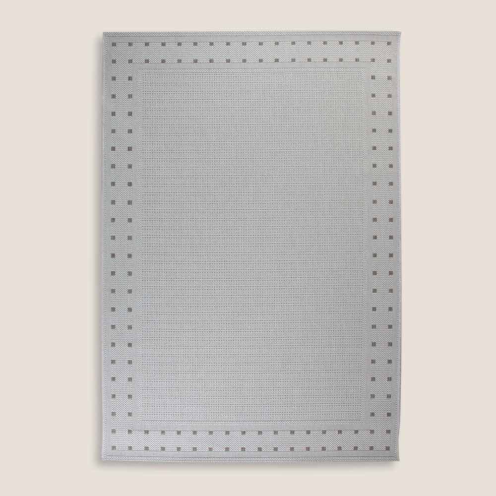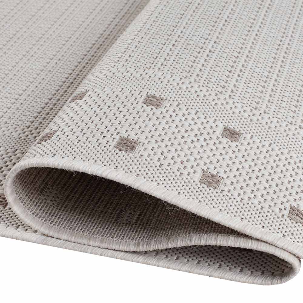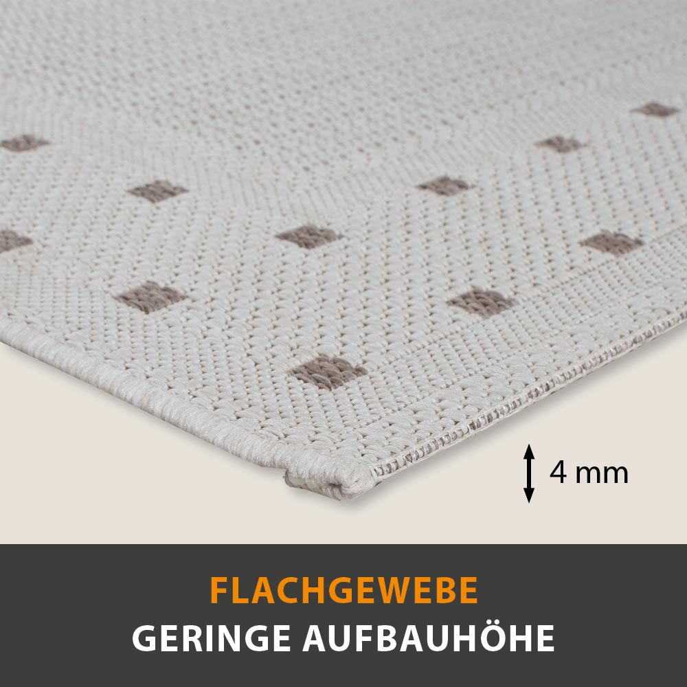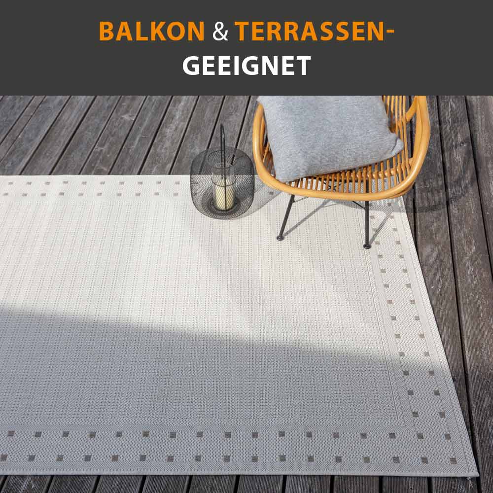 Der Teppich Palma in Creme ist ein robuster Flachgewebeteppich für den Innen- und Außenbereich. Mit seinem widerstandsfähigen Material eignet er sich ideal für Wohnzimmer, Essbereich, Balkon oder Terrasse. Ein feines Muster aus kleinen, etwas dunkleren Vierecken verleiht dem Teppich eine moderne und strukturierte Optik. Die Oberfläche ist pflegeleicht, wetterbeständig und bleibt auch bei häufiger Nutzung formstabil. Durch das dezente Design lässt sich der Outdoorteppich vielseitig kombinieren. Mit einer Größe von 200 x 240 cm bietet er ausreichend Fläche, um Wohn- oder Sitzbereiche stilvoll zu betonen. Der Teppich Palma verbindet langlebige Qualität mit zeitgemäßem Stil.