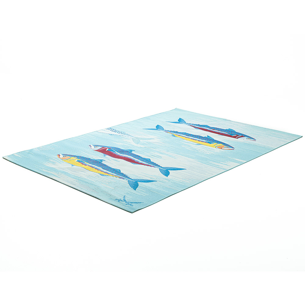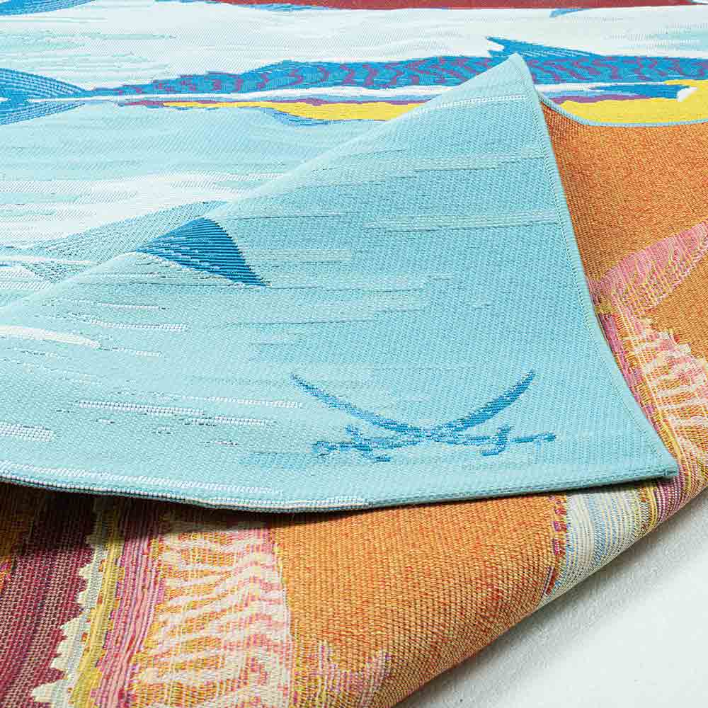 Sommer, Sonne, Sansibar! Der "Rantum Beach SA015" ist ein topaktueller, sehr strapazierfähiger Outdoor-/Indoor-Teppich, mit dem Sie sich den Sommer in Ihren Garten, auf Ihre Terrasse oder in Ihren Wohnbereich holen. Die verwendeten sehr widerstandsfähigen Synthetik Fasern bringen hervorrangende Nutzungseigenschaften mit sich, sie halten nicht nur größten Beanspruchungen stand, sondern sind auch feuchtigkeits- und UV-beständig. Die vier bunten Fische auf dem hellblauen Meereshintergrund sind ein sommerlicher Hingucker, egal ob drinnen oder draußen. Der Teppich ist Fußbodenheizung geeignet und hat ein Maß von 190 x 290 cm.