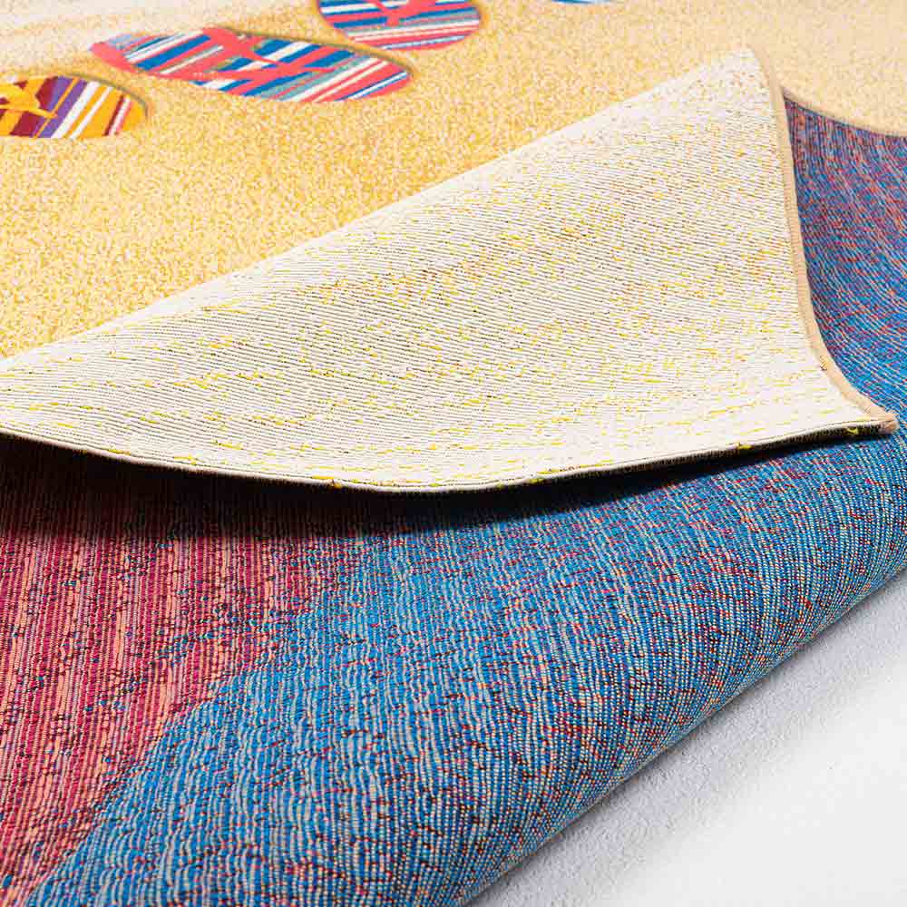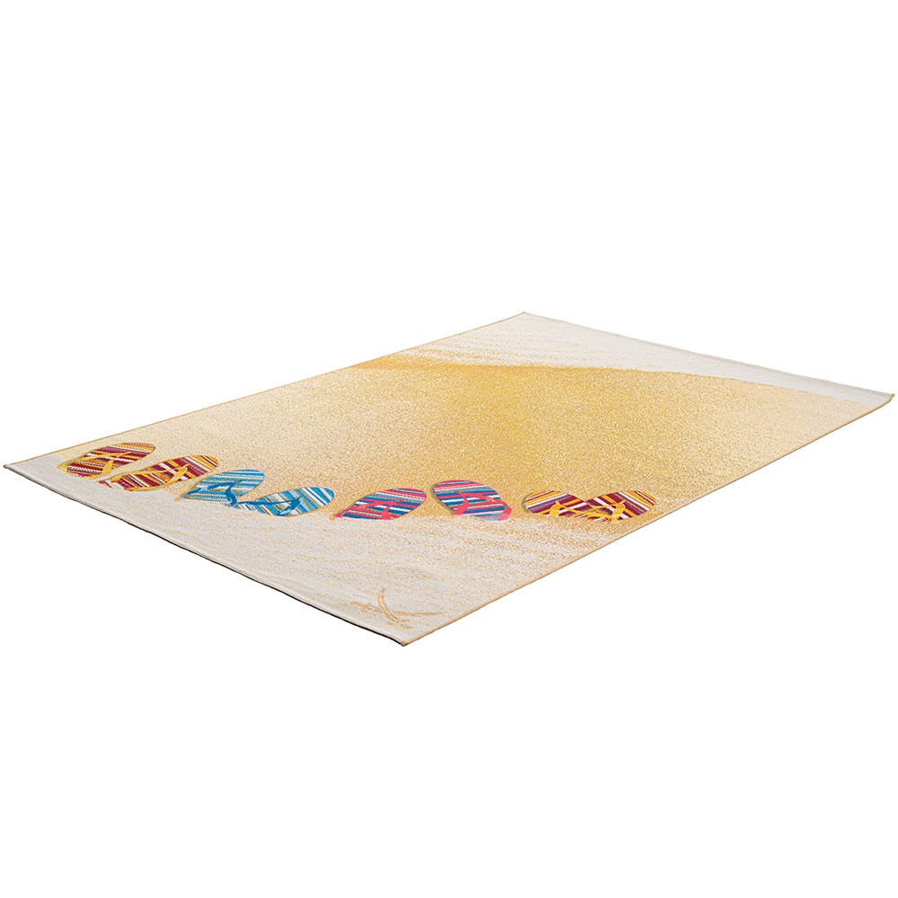 Der Teppich "Rantum Beach" aus der Sansibar Kollektion ist ein topaktueller, sehr strapzierfähiger Outdoor- und Indoor-Teppich mit einem farbenfrohen Design. Er bringt das berühmte Sansibar-Feeling "Urlaub, Freizeit und Glück" auf Ihre Terasse, in Ihren Garten oder in Ihr Wohn- und Esszimmer. Selbst als Küchen- oder Kinderzimmerteppich eignet sich diese robuste Qualität, außerdem hält das kurze Flachgewebe, dank der Materialzusammensetzung auch der größten Beanspruchung stand und ist Feuchtigkeits- sowie UV-Strahlen resistent. Das Strand-Design sind ein echter Sommerhit. Der Teppich ist Fußbodenheizung geeignet und hat ein Maß von 190 x 290 cm.