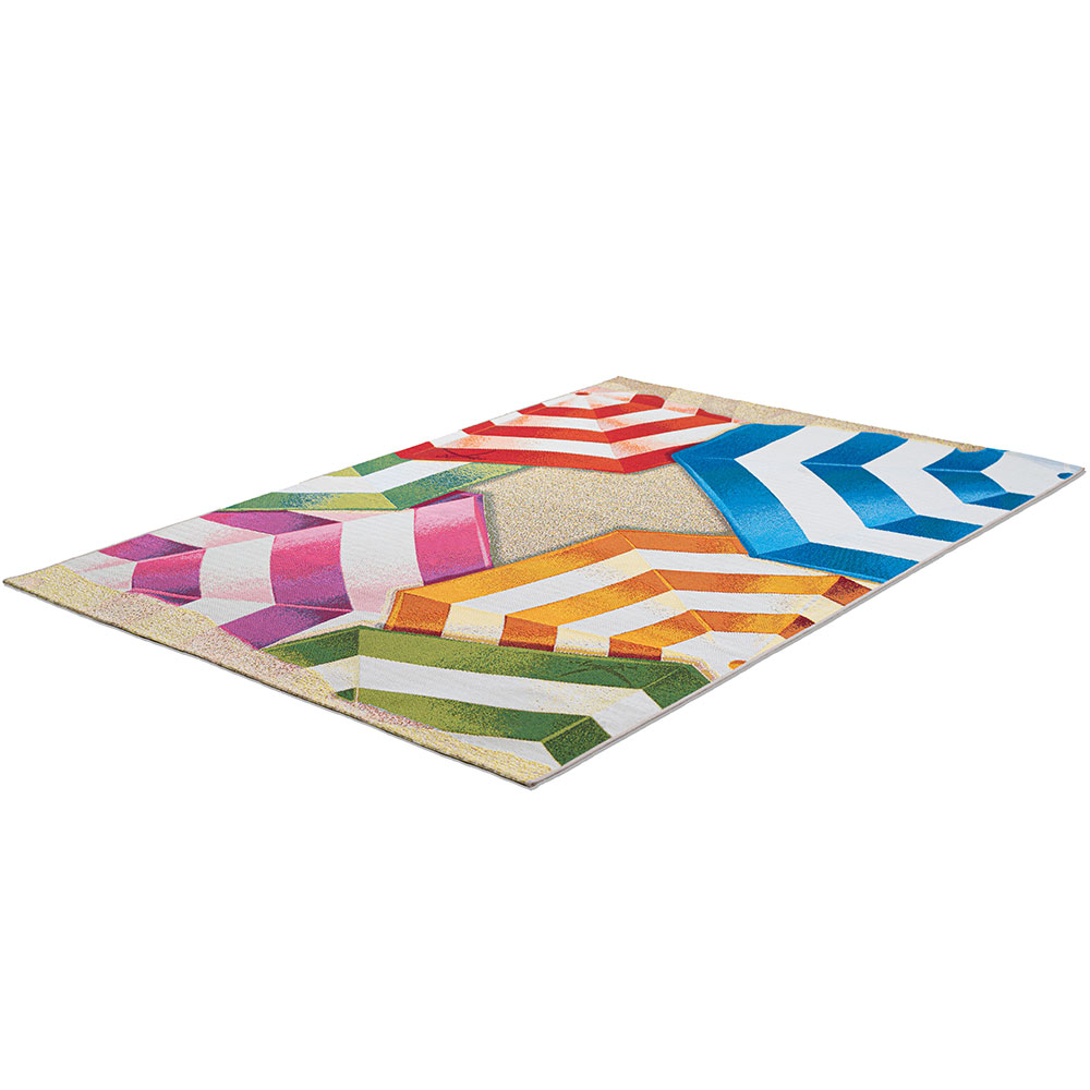 Der Teppich "Rantum Beach" aus der Sansibar Kollektion ist ein topaktueller, sehr strapzierfähiger Outdoor- und Indoor-Teppich mit einem farbenfrohen Design. Er bringt das berühmte Sansibar-Feeling "Urlaub, Freizeit und Glück" auf Ihre Terasse, in Ihren Garten oder in Ihr Wohn- und Esszimmer. Selbst als Küchen- oder Kinderzimmerteppich eignet sich diese robuste Qualität, außerdem hält das kurze Flachgewebe, dank der Materialzusammensetzung auch der größten Beanspruchung stand und ist Feuchtigkeits- sowie UV-Strahlen resistent. Das bunte Sonnenschirm-Design sind ein echter Sommerhit. Der Teppich ist Fußbodenheizung geeignet und hat ein Maß von 240 x 340 cm.