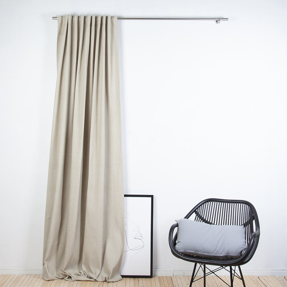 Der unifarbene Vorhang Kampen in beige verleiht Ihrem zu Hause mehr Wohnlichkeit. Das blickdichte Material wurde aus 100 % Baumwolle gewebt. Zum Anbringen der Gardine wurde ein Durchschubband verarbeitet, so könne Sie die Raffung an Ihre Wünsche anpassen. Zusätzlich erhalten Sie ein Bügelband, um den Vorhang individuell zu kürzen. Die Maße des Schals sind 145 x 270 cm.